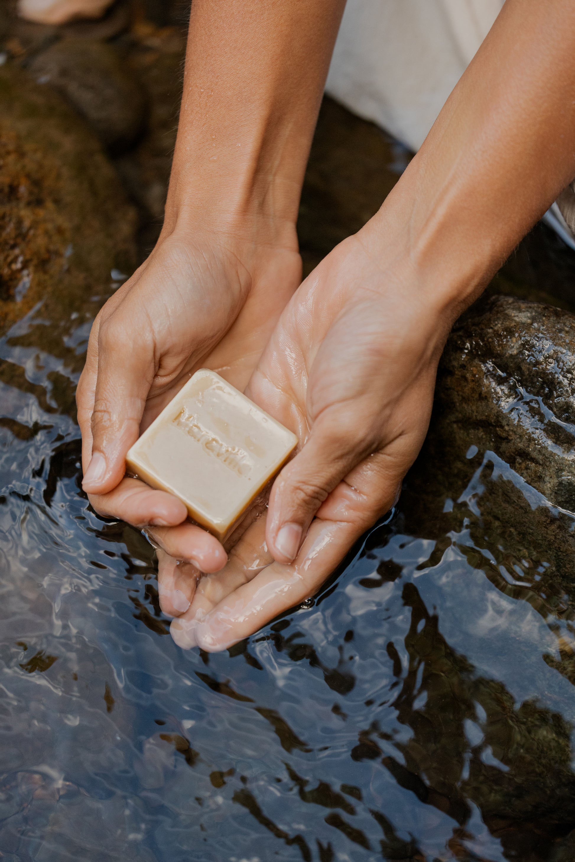 Prendre le savon en main sous l'eau et frotter. Une fois que la mousse apparait, poser le savon et laver la zone souhaitée. Rincer à l'eau claire une fois la zone propre.